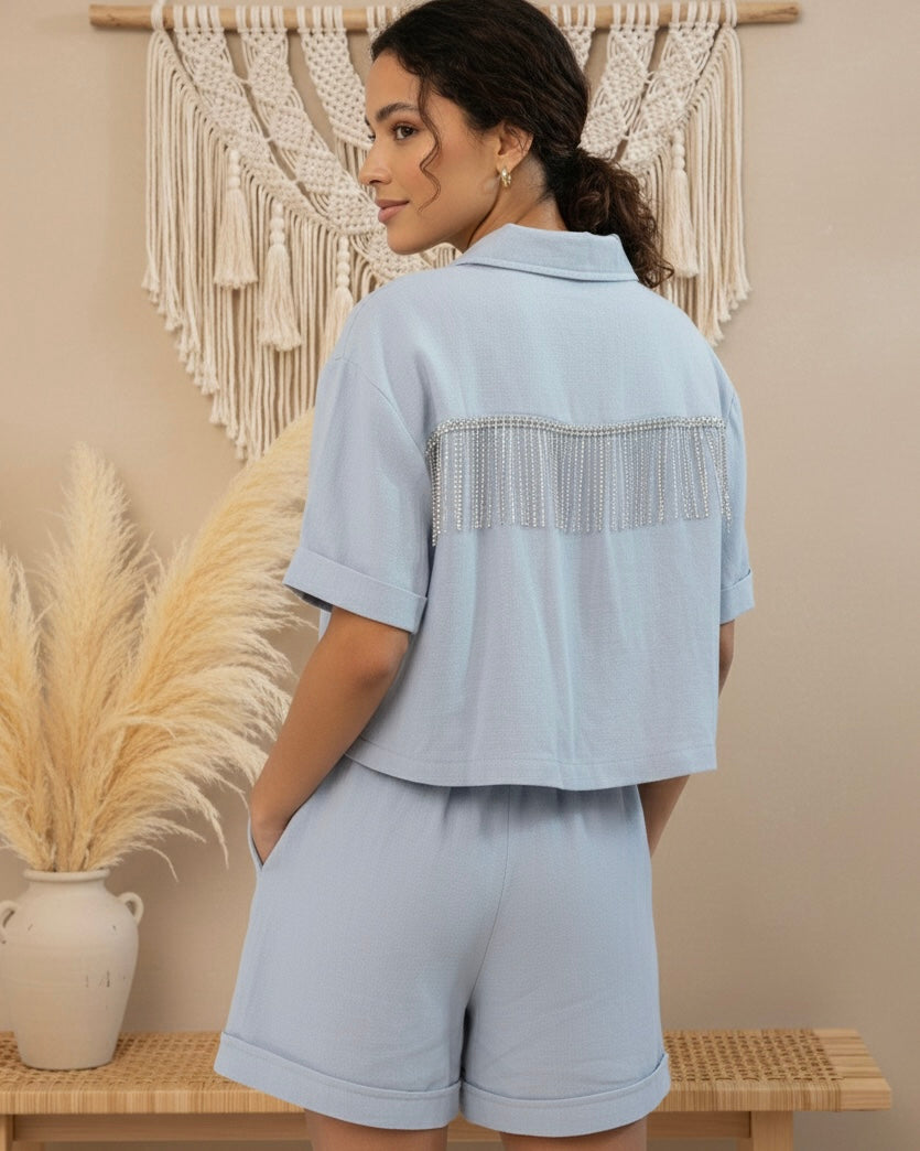 Meet the Isla Breeze Set — a relaxed snap-up crop shirt with a soft, linen-like texture and matching high-rise shorts. The elastic hem ensures an effortless, flattering fit that feels like a vacation in every wear. Perfect for lounging, strolling, or styling up.